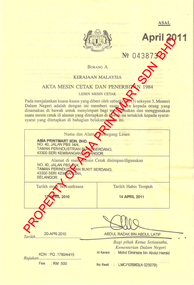 We have license from Kementerian Dalam Negeri to operate as printer.